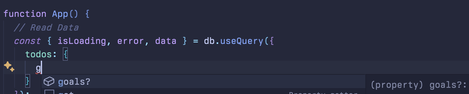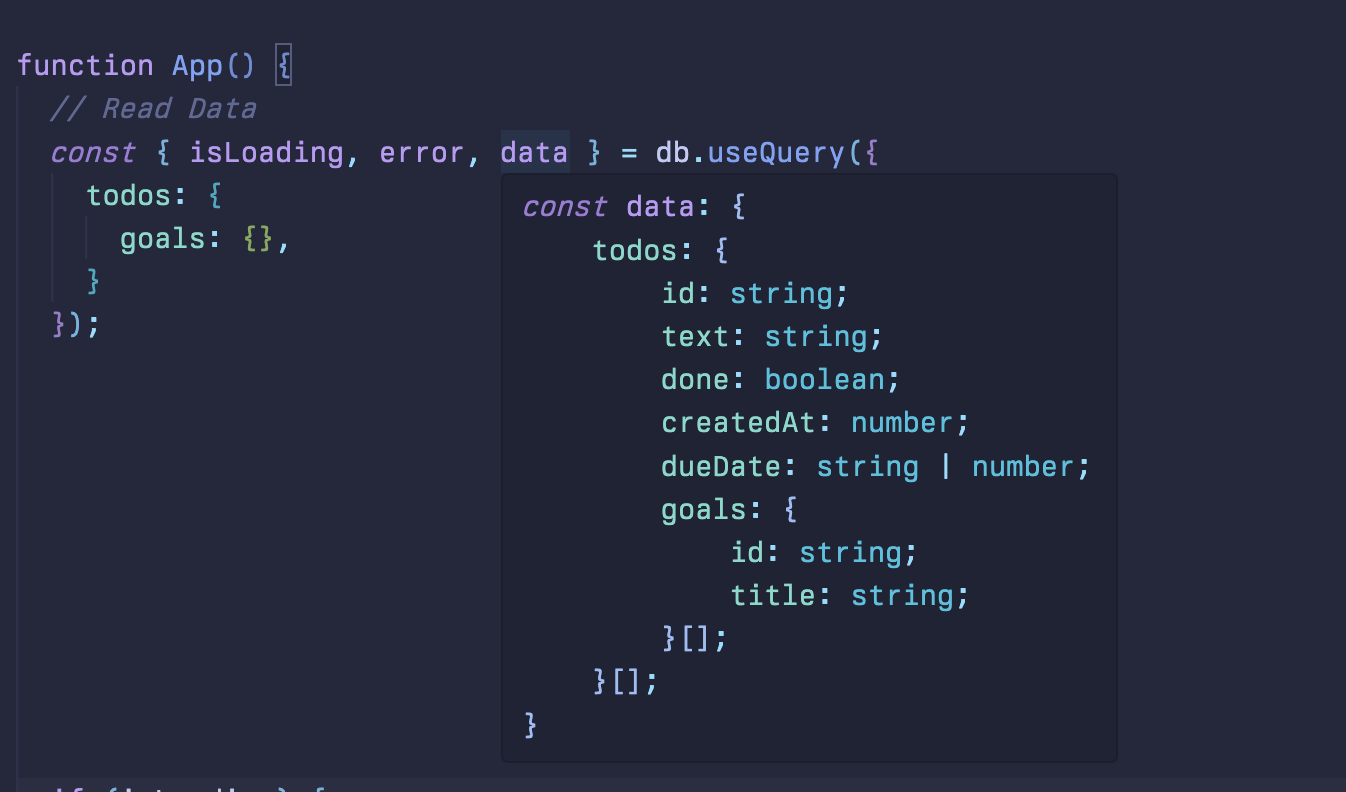 const query = {todos: {goals: {},},};const { isLoading, error, data } = db.useQuery(query);