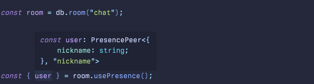 const room = db.room('chat', 'hacker-chat-room-id');// We only return the `status` value for each peer// We will _only_ trigger an update when a user's `status` value changesconst { user, peers, publishPresence } = db.rooms.usePresence(room, {keys: ['status'],});